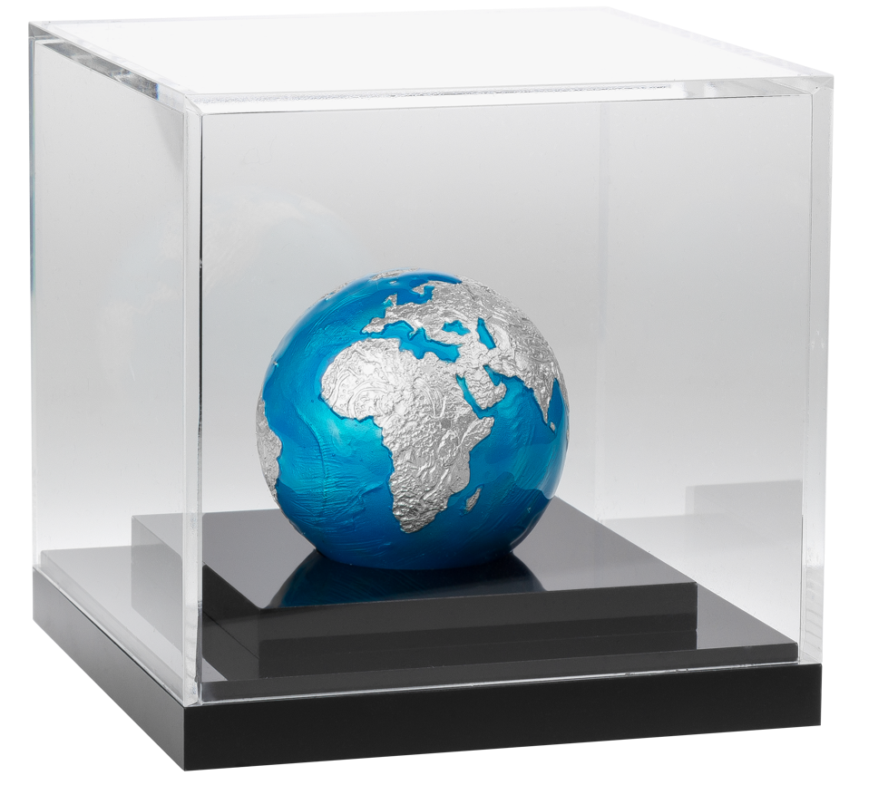 The spherical 3oz fine silver (.999) represents the Earth and features the continents slightly raised above the sea, which is painted in a translucent blue enamel colour. At the bottom of the globe is Barbados’ Coat of Arms printed on a silver circle.
