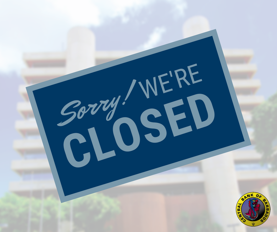 Due to the anticipated passing of Tropical Storm Dorian, the Central Bank of Barbados will be closed today. The Bank apologises for any inconvenience caused and will announce when it will resume operations after the system has passed.